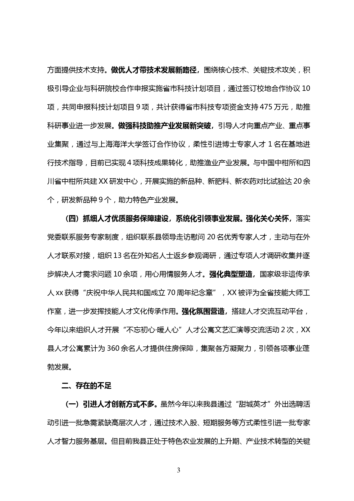 XX县集聚人才活力,引领事业发展新动力XX县坚持党管人才原则,强化对人才工作的领导,围绕经济强县和文化名城建设,大力实施重点人才工程,强化人才平台建设,进一步落实人才服务保障,切实加强全县人才队伍建设,不断发挥优秀人才助推全县产业发展新动能,现将2019年人才工作总结如下:一、强化“四项关键”体系建设,引领各项事业蓬勃发展(一)抓牢制度建设之基建设,制度化引领人才发展。强化党对人才工作领导,依托专题人才座谈会,凝聚人才思想共识,组织召开年轻干部人才座谈会、全县科技工作者座谈会等专题座谈会,引导专业人才、青年人才、科技人才等类别人才创新发展。优化人才工作队伍,根据机构改革、县人才工作实际等情况,调整县人才工作领导议事协调机构,完善《XX县人才工作领导小组工作规则》《XX县人才工作领导小组办公室工作细则》,优化成员单位结构和议事规则程序,进一步加强对人才工作的领导。深化人才发展体制机制改革,立足引才过...