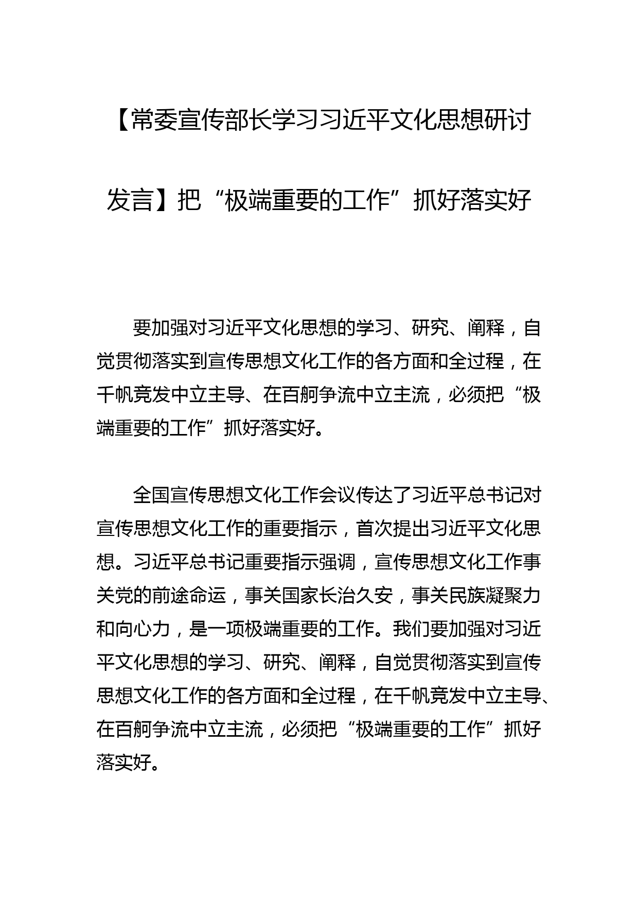 【常委宣传部长学习习近平文化思想研讨发言】把“极端重要的工作”抓好落实好要加强对习近平文化思想的学习、研究、阐释,自觉贯彻落实到宣传思想文化工作的各方面和全过程,在千帆竞发中立主导、在百舸争流中立主流,必须把“极端重要的工作”抓好落实好。全国宣传思想文化工作会议传达了习近平总书记对宣传思想文化工作的重要指示,首次提出习近平文化思想。习近平总书记重要指示强调,宣传思想文化工作事关党的前途命运,事关国家长治久安,事关民族凝聚力和向心力,是一项极端重要的工作。我们要加强对习近平文化思想的学习、研究、阐释,自觉贯彻落实到宣传思想文化工作的各方面和全过程,在千帆竞发中立主导、在百舸争流中立主流,必须把“极端重要的工作”抓好落实好。要旗帜鲜明地把“极端重要的工作”摆上极端重要的位置。习近平总书记强调:“要加强党对宣传思想工作的全面领导,旗帜鲜明坚持党管宣传、党管意识形态。”“看一个领导干部是否成熟...