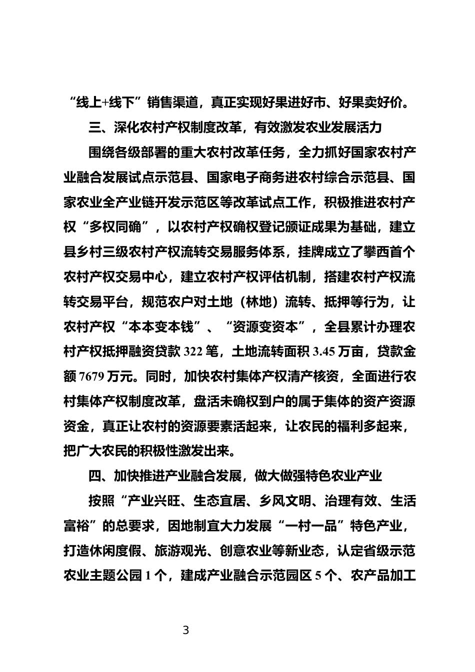 1发展特色农业产业情况汇报XX县属南亚热带干热河谷立体气候,是天然的“大地温室”和全国少有的低纬度、高海拔热作区。近年来,XX县以建设国家现代农业示范区为契机,紧紧围绕农业供给侧结构性改革,依托“六度禀赋”优势,运用工业发展思维发展产业化、规模化、特色化的现代农业,以农民增收为核心、以新村建设为载体、以产业发展为支撑,深入实施“农业富县、三产活县、旅游兴县”战略,特色农业产业发展取得显著成效。20XX年实现农业总产值23亿元,增加值14.13亿元,增速4.4%。实现农村居民人均可支配收入达15776元,同比增长9.2%。一、切实完善农业基础设施,优化提升农业产业结构坚持以打造山区现代农业的标杆样板为目标,按照“用途不变、渠道不乱、各尽其责、各投其资、各记其功”的原则,全面整合涉农项目资金,不断完善产区水、电、路、渠、棚、灌等基础设施,全面实现村村通水泥路。现已建成高标准农田20万亩,提灌站443座,产区水利工程有效灌溉...
