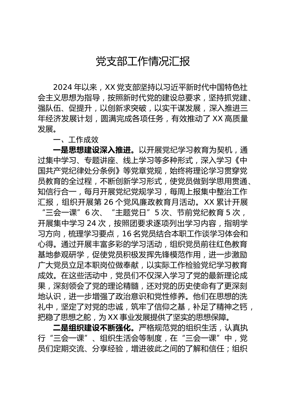 党支部工作情况汇报2024年以来,XX党支部坚持以习近平新时代中国特色社会主义思想为指导,按照新时代党的建设总要求,坚持抓党建、强队伍、促提升,以创新求突破,以实干谋发展,深入推进三年经济发展计划,圆满完成各项任务,有效推动了XX高质量发展。一、工作成效一是思想建设深入推进。以开展党纪学习教育为契机,通过集中学习、专题讲座、线上学习等多种形式,深入学习《中国共产党纪律处分条例》等党章党规,始终将理论学习贯穿党员教育的全过程,不断创新学习形式,使党员做到学思用贯通、知信行合一,每月开展党纪党规学习,每周上报集中整治工作汇报,组织开展第26个党风廉政教育月活动。XX累计开展“三会一课”6次、“主题党日”5次、节前党纪教育5次,开展集中学习24次,按照团要求逐项列出学习内容,指明学习方向,梳理学习要点,16名党员结合本职工作谈学习体会和心得。通过开展丰富多彩的学习活动,组织党员前往红色教育基地参观研学,促使党员...