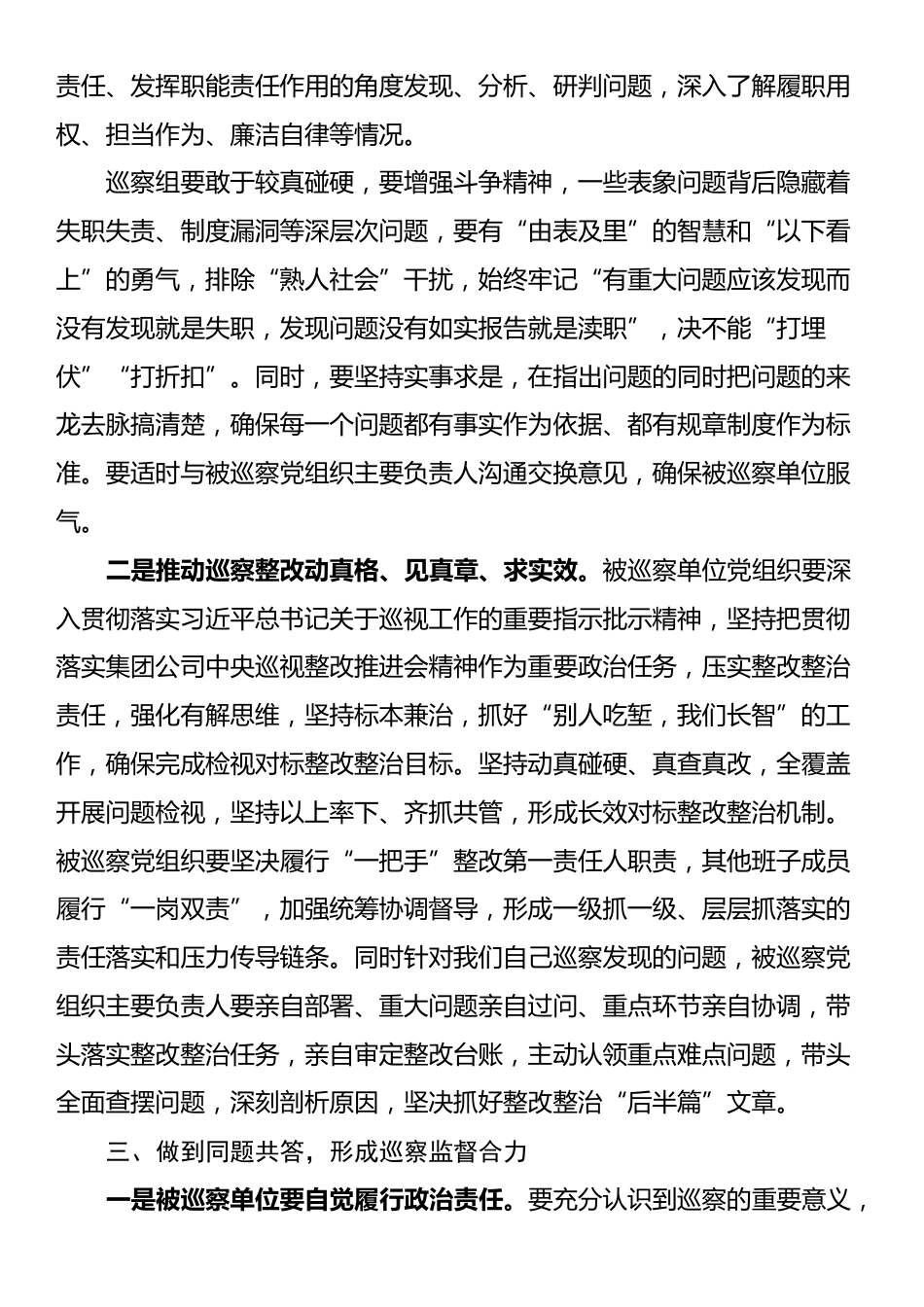 在公司党委巡察进驻工作会上的讲话同志们:今天我们召开*公司党委巡察进驻工作会,刚才,*同志宣读了巡察组组长、副组长授权任职和任务分工,*同志做了巡察工作安排。巡察队伍是保障高质量巡察工作的基础,公司党委高度重视巡察力量配备,本次巡察队伍选取经验丰富的领导干部担任组长、副组长,配备政治素质好、专业能力强的巡察人员,注意新老搭配、发挥传帮带作用。下面我代表*公司党委讲三点意见。一、提高政治站位,把准巡察监督政治方向一是要充分认识巡察监督的重要性。巡察监督是党和国家监督体系的重要组成部分,是全面从严治党的战略性制度安排。党的二十大以来,习近平总书记、党中央从推进党的自我革命、全面从严治党的战略高度,对巡视巡察工作作出一系列新部署。二十届中央纪委三次全会明确提出并深刻阐述习近平总书记关于党的自我革命的重要思想,为我们坚定不移推进巡察工作高质量发展提供了遵循。*公司巡察工作要聚焦创新发展、合规经营开展...