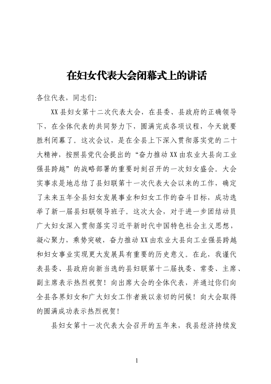 在妇女代表大会闭幕式上的讲话各位代表,同志们:XX县妇女第十二次代表大会,在县委、县政府的正确领导下,在全体代表的共同努力下,圆满完成各项议程,今天就要胜利闭幕了。这次会议,是在全县上下深入贯彻落实党的二十大精神,按照县党代会提出的“奋力推动XX由农业大县向工业强县跨越”的战略部署的重要时刻召开的一次妇女盛会。大会实事求是地总结了县妇联第十一次代表大会以来的工作,确定了未来五年全县妇女发展事业和妇女工作的奋斗目标,成功选举了新一届县妇联领导班子。这次大会,对于进一步团结动员广大妇女深入贯彻落实习近平新时代中国特色社会主义思想,凝心聚力,乘势突破,奋力推动XX由农业大县向工业强县跨越和妇女事业实现更大发展具有重要的历史意义。在此,我谨代表县委、县政府向新当选的县妇联第十二届执委、常委、主席、副主席表示热烈祝贺!向出席大会的全体代表,并通过你们向全县各界妇女和广大妇女工作者致以亲切的问候!向大会...