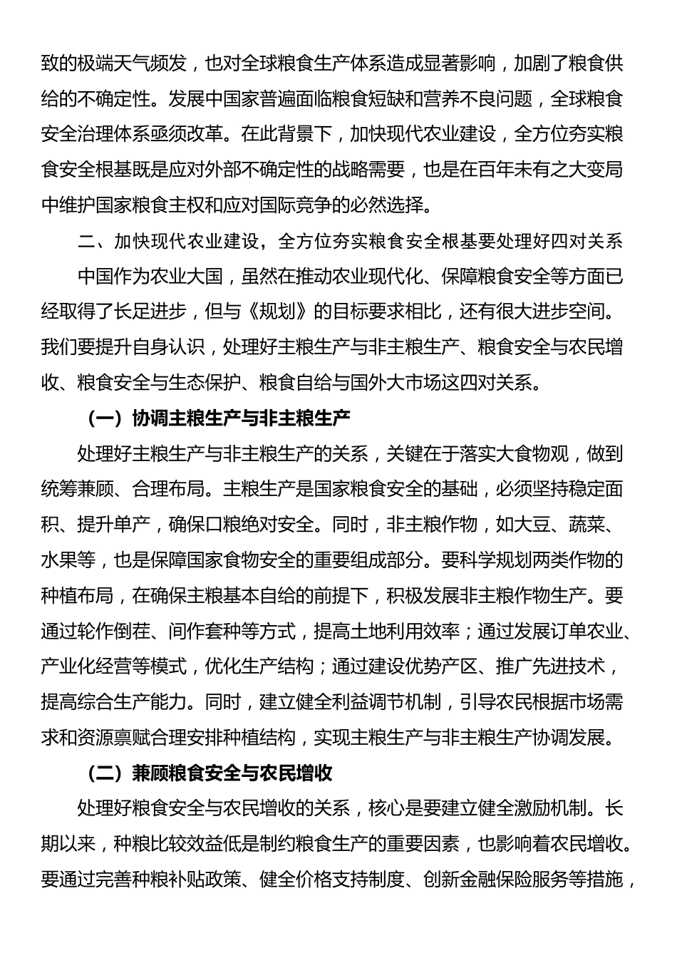 解读《乡村全面振兴规划(2024-2027年)》党课讲稿:加快现代农业建设夯实粮食安全根基实施乡村振兴战略是以重要领导为核心的党中央着眼党和国家事业全局作出的重大决策,是新时代新征程“三农”工作的总抓手。中共中央、国务院印发的《乡村全面振兴规划(2024—2027年)》(以下简称《规划》)明确提出,到2027年要实现“国家粮食安全根基更加稳固,农业综合生产能力稳步提升,确保中国人的饭碗牢牢端在自己手中”的重要目标,并将“加快现代农业建设,全方位夯实粮食安全根基”列为九项重点任务之一。我们要深入学习贯彻落实《规划》精神,为实现乡村全面振兴的宏伟目标作出积极贡献。一、加快现代农业建设,全方位夯实粮食安全根基的重要意义重要领导强调,粮食多一点少一点是战术问题,粮食安全是战略问题。农业是国民经济的根基和命脉,农业现代化是中国式现代化的关键,农业发展水平不仅关乎国家粮食安全,更是经济发展和社会稳定的重要保障。无论是...