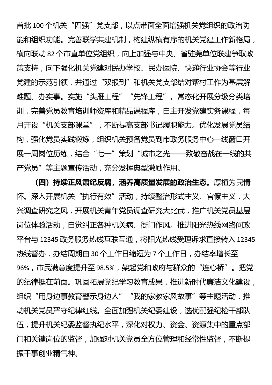 市直机关工委关于一季度落实全面从严治党主体责任工作情况的报告今年以来,市直机关工委坚持以习近平新时代中国特色社会主义思想为指导,认真学习贯彻党的二十大及二十届三中全会精神,深刻把握习近平总书记“7·9”重要讲话这个根本遵循,坚决落实全面从严治党主体责任,坚持守正创新,主动担当作为,全面提高机关党建质量,以高质量机关党建引领和保障高质量发展、现代化建设。一、主要工作情况(一)强化思想政治引领,把牢高质量发展的正确方向。深化政治机关建设。落实“第一议题”学习制度,及时跟进学习习近平总书记重要讲话和指示批示精神,推动政治机关意识教育、对党忠诚教育向机关科室和基层单位延伸,深化以机关党建推动党中央关于本部门、本领域决策部署和习近平总书记重要指示批示精神贯彻落实,健全学查改常态化机制。围绕“讲政治、守纪律、负责任、有效率”深化模范机关创建,出台《市直机关模范机关创建先进单位和标兵单位评选办法》,开...