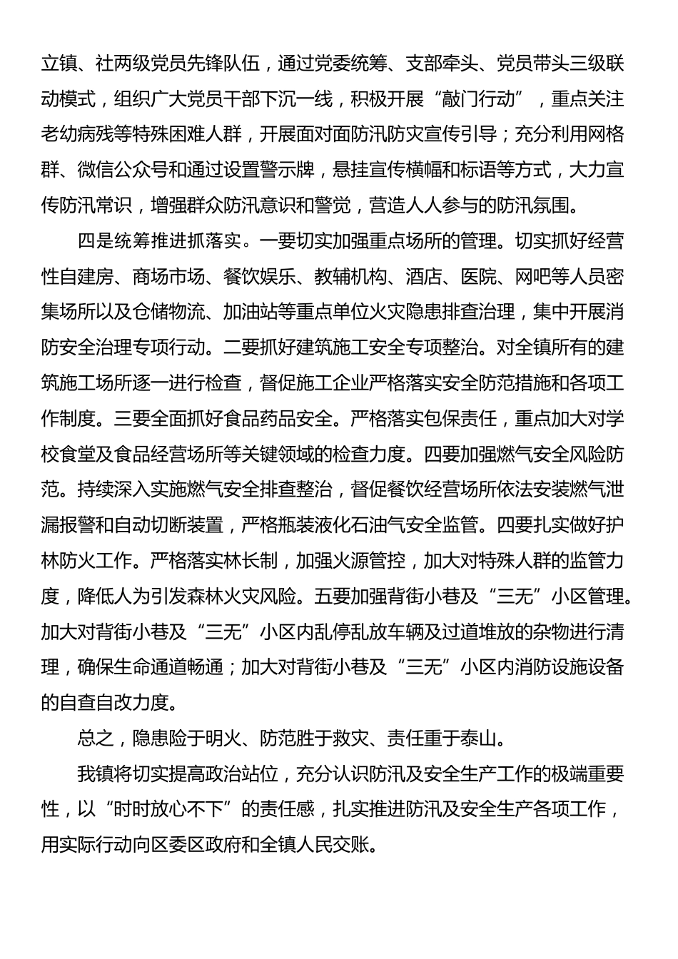 在2025年区安委会第三次全体(扩大)会议上的发言各位领导、同志们:按照会议安排,现就**镇城区防汛及安全生产工作做一简要发言,不妥之处,敬请批评指正。2025年,在区委、区政府的正确领导下,我镇牢固树立安全发展理念,坚持人民至上、生命至上,始终保持“时时放心不下”的责任感,严查密防各类安全风险隐患,严格落实各项安全管控措施。在下一步的工作中,我镇将认真贯彻落实今天会议精神,不断强化责任,切实把防汛及安全生产各项措施落到实处。一是提高认识抓落实。我镇处于一江一河和北山11条沟的包围之中,特殊的地理位置决定了防汛任务艰巨。我镇将从讲政治、讲大局的高度,增强责任感和紧迫感,坚决克服麻痹思想和侥幸心理,充分调动镇社两级干部攻坚克难的干劲和担当作为,以高度责任感对待防汛备汛工作,将保障人民生命财产安全放在首位。二是周密部署抓落实。我镇将对照工作要求,周密部署、明确任务、传导压力、细化责任、落实到人。会后,...
