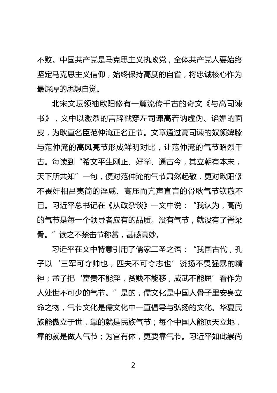 1党性修养心得体会古人云:人无刚骨,安身不牢。气节是人生的灵魂支柱和精神脊梁。孔子用“三军可夺帅也,匹夫不可夺志也”称赞气节,孟子倡导“善养吾浩然之气”涵养气节。清代的魏源,把“立节”同《左传》提出的“立德、立功、立言”并列,将“三不朽”补充为“四不朽”。纵观历史不难发现,“凡有成就者,必有高风亮节”。有了气节,人品就有了高度,人格就有了硬度,就能成就一个个顶天立地“大写的人”。气节、风骨是我国古代先贤独特的品格气质和信念追求,是一种刚正不阿的气概,是一种顽强拼搏的品质,更是一种坚韧不拔的精神。政治气节体现在对党忠诚。政治气节犹如壁立千仞,耸立起共产党人的声誉和威望。正因为心中信仰笃定、初心如磐,一个人才能站得直、立得正,遇事压不弯、打不败。因此广大党员干部要培育和涵养政治气节、政治风骨,始终保持共产党人充盈的浩然正气。气节纯则党性纯,党性正则骨气硬。正因为心中信仰笃定、初心如磐,一个人...