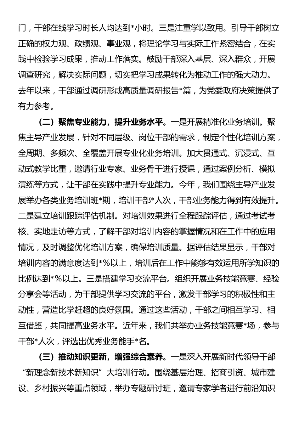 在2025年全省组织工作交流会议上的发言材料尊敬的各位领导,同志们:全国组织部长会议强调,要把从严管理监督和鼓励担当作为统一起来,激励广大干部锐意进取、奋勇争先。党的干部是党和国家事业的中坚力量,建设堪当民族复兴重任的高素质干部队伍,事关党和国家事业的兴旺发达、长治久安。一直以来,我单位始终坚持以习近平新时代中国特色社会主义思想为指导,深入贯彻新时代党的建设总要求和新时代党的组织路线,坚持理论铸魂强能、鲜明用人导向、严管厚爱结合,把激励干部担当作为放在高质量发展大局中系统谋划,鼓励干部敢闯敢拼、敢为人先,为推动地方经济社会高质量发展提供了坚强的组织保障。下面,根据会议安排,我谈几点浅见,以供同志们参考。一、健全素质能力培养体系,让干部善担当、能作为面对新形势、新任务,我们需遵循干部成长规律,坚持供给侧与需求侧相统一,全面提升干部现代化建设能力,为干部担当作为奠定坚实基础。(一)强化理论武装...