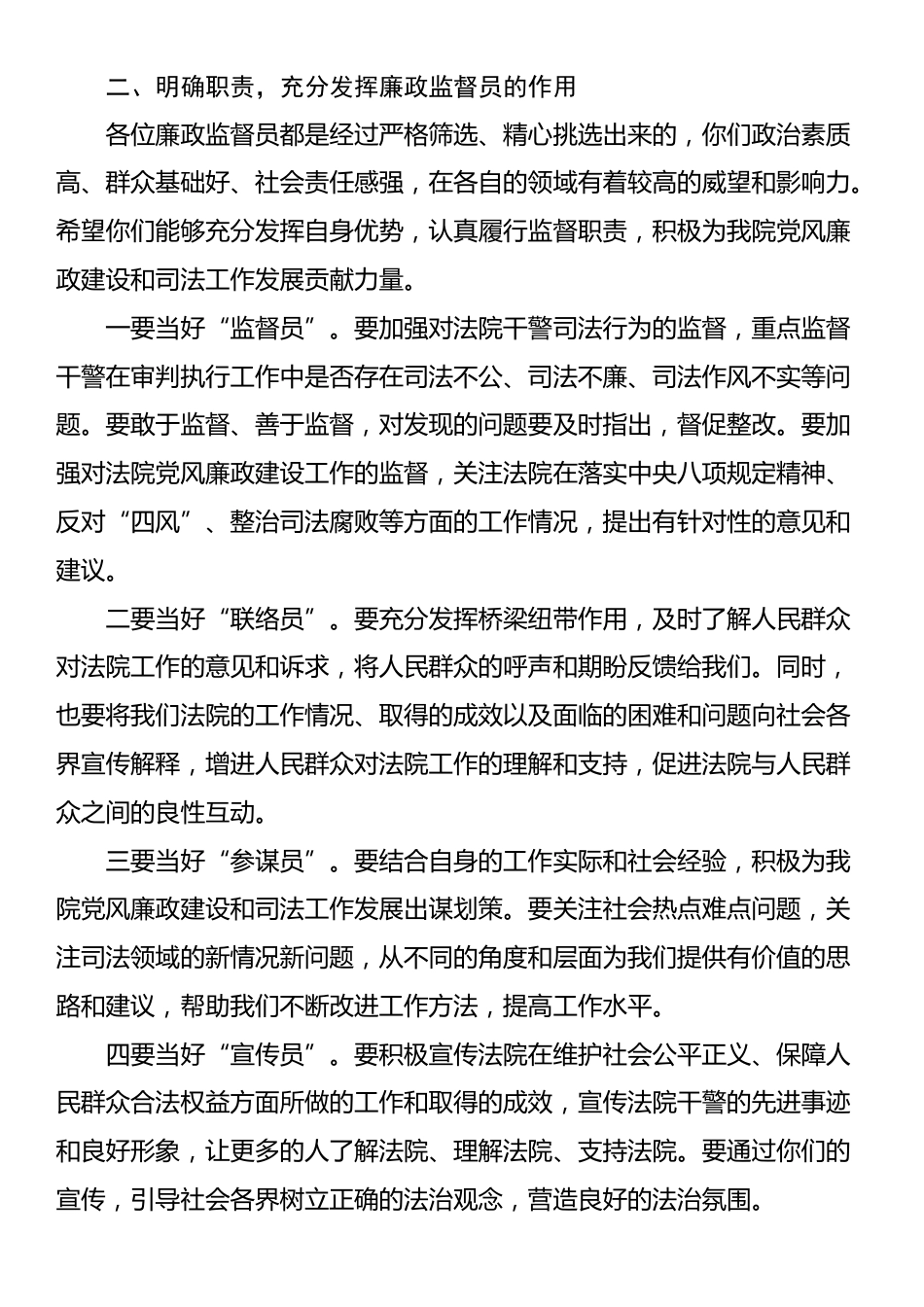 在县人民法院廉政监督员聘任会议上的讲话尊敬的各位廉政监督员、同志们:大家好!今天,我们在这里隆重召开县人民法院廉政监督员聘任会议,这是我院加强党风廉政建设、推进司法作风转变、深化司法公开的一项重要举措,也是我院主动接受社会监督、密切联系群众、提升司法公信力的一次生动实践。首先,我代表县人民法院党组和全体干警,向新聘任的各位廉政监督员表示热烈的欢迎和衷心的感谢!向长期以来关心支持法院工作的社会各界人士表示崇高的敬意!近年来,我院在县委的坚强领导、县人大及其常委会的有力监督、县政府的大力支持、县政协的民主监督以及上级法院的精心指导下,坚持以习近平新时代中国特色社会主义思想为指导,深入学习贯彻党的二十大精神,紧紧围绕“努力让人民群众在每一个司法案件中感受到公平正义”的目标,忠实履行宪法法律赋予的职责,扎实推进司法体制改革,不断加强队伍建设,各项工作取得了新进展。但我们也清醒地认识到,随着经济...