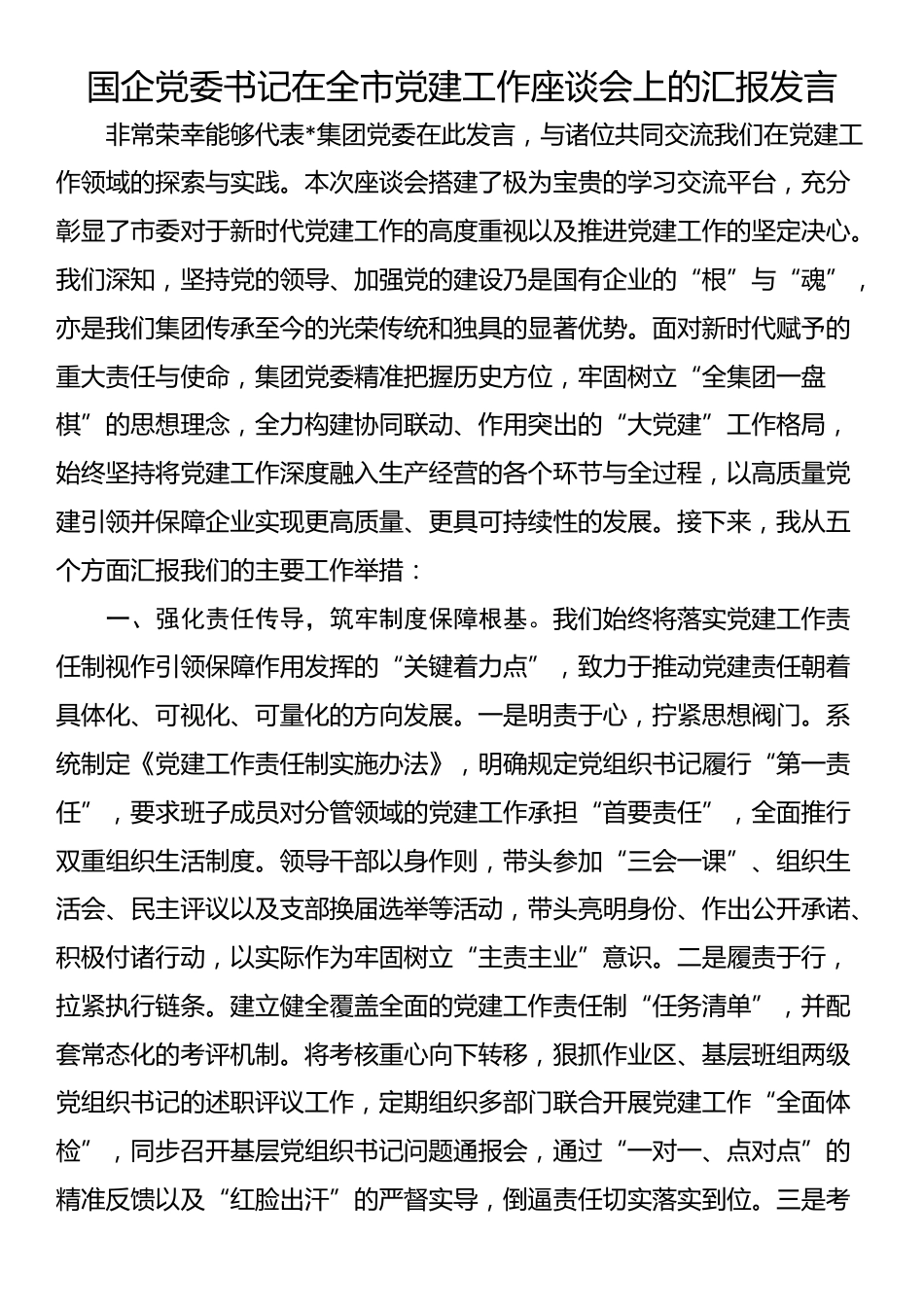 国企党委书记在全市党建工作座谈会上的汇报发言非常荣幸能够代表*集团党委在此发言,与诸位共同交流我们在党建工作领域的探索与实践。本次座谈会搭建了极为宝贵的学习交流平台,充分彰显了市委对于新时代党建工作的高度重视以及推进党建工作的坚定决心。我们深知,坚持党的领导、加强党的建设乃是国有企业的“根”与“魂”,亦是我们集团传承至今的光荣传统和独具的显著优势。面对新时代赋予的重大责任与使命,集团党委精准把握历史方位,牢固树立“全集团一盘棋”的思想理念,全力构建协同联动、作用突出的“大党建”工作格局,始终坚持将党建工作深度融入生产经营的各个环节与全过程,以高质量党建引领并保障企业实现更高质量、更具可持续性的发展。接下来,我从五个方面汇报我们的主要工作举措:一、强化责任传导,筑牢制度保障根基。我们始终将落实党建工作责任制视作引领保障作用发挥的“关键着力点”,致力于推动党建责任朝着具体化、可视化、可量化的...