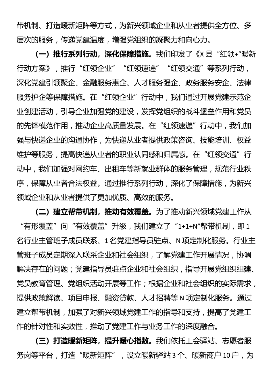 县委书记在新兴领域党建工作座谈会上的讲话同志们:新兴领域党建作为基层党建的重要组成部分,是推动党的建设高质量发展的新领域、新阵地。近年来,X县紧扣新兴领域特点,积极探索创新,以组织覆盖为基础、服务赋能为纽带、力量共融为关键,系统推进新兴领域党建提质增效,让“新”领域成为党建引领基层治理的“热阵地”。下面,我结合X县的实际工作,从三个方面与大家交流分享。一、组织覆盖“破网”,筑牢红色根基组织建设是党的建设的重要基础。在新兴领域,党组织覆盖的广度和深度直接关系到党的领导和党的工作能否有效落实。我们通过构建责任体系、动态摸排情况、精准覆盖组建等方式,着力破解新兴领域党组织覆盖难题,筑牢红色根基。(一)构建责任体系,凝聚工作合力。新兴领域党建涉及面广、情况复杂,需要各方协同配合、形成合力。我们构建了“县委统一领导、组织部牵头抓总、社会工作部抓具体指导、各行业主管部门抓落实、乡镇(街道)兜底管理”...