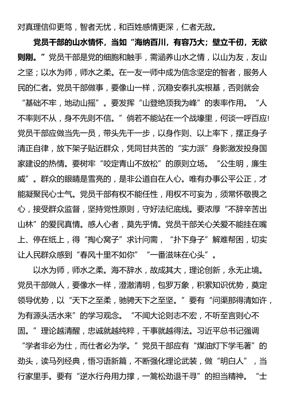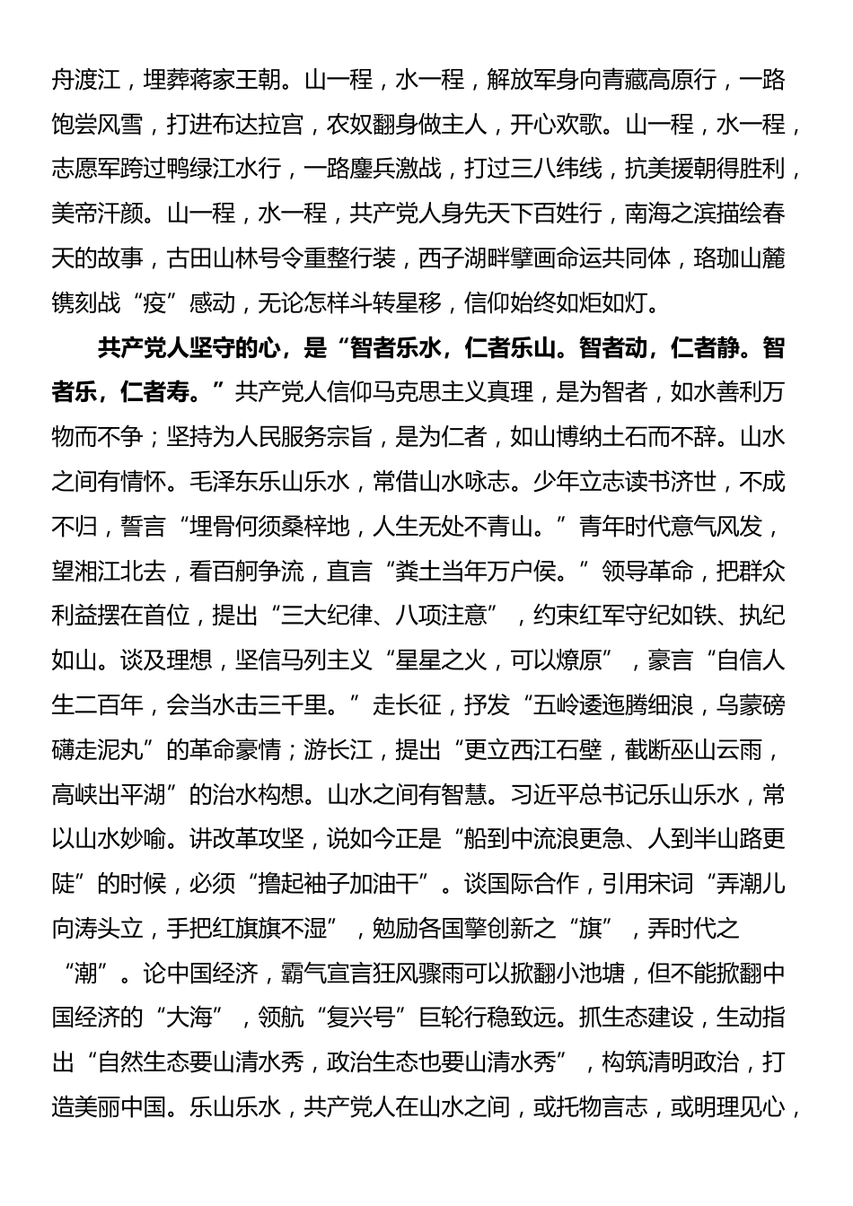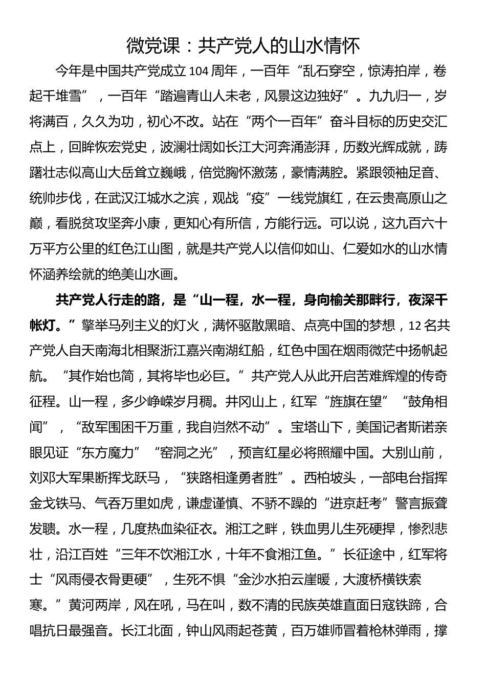 微党课:共产党人的山水情怀今年是中国共产党成立104周年,一百年“乱石穿空,惊涛拍岸,卷起千堆雪”,一百年“踏遍青山人未老,风景这边独好”。九九归一,岁将满百,久久为功,初心不改。站在“两个一百年”奋斗目标的历史交汇点上,回眸恢宏党史,波澜壮阔如长江大河奔涌澎湃,历数光辉成就,踌躇壮志似高山大岳耸立巍峨,倍觉胸怀激荡,豪情满腔。紧跟领袖足音、统帅步伐,在武汉江城水之滨,观战“疫”一线党旗红,在云贵高原山之巅,看脱贫攻坚奔小康,更知心有所信,方能行远。可以说,这九百六十万平方公里的红色江山图,就是共产党人以信仰如山、仁爱如水的山水情怀涵养绘就的绝美山水画。共产党人行走的路,是“山一程,水一程,身向榆关那畔行,夜深千帐灯。”擎举马列主义的灯火,满怀驱散黑暗、点亮中国的梦想,12名共产党人自天南海北相聚浙江嘉兴南湖红船,红色中国在烟雨微茫中扬帆起航。“其作始也简,其将毕也必巨。”共产党人从此开启苦...